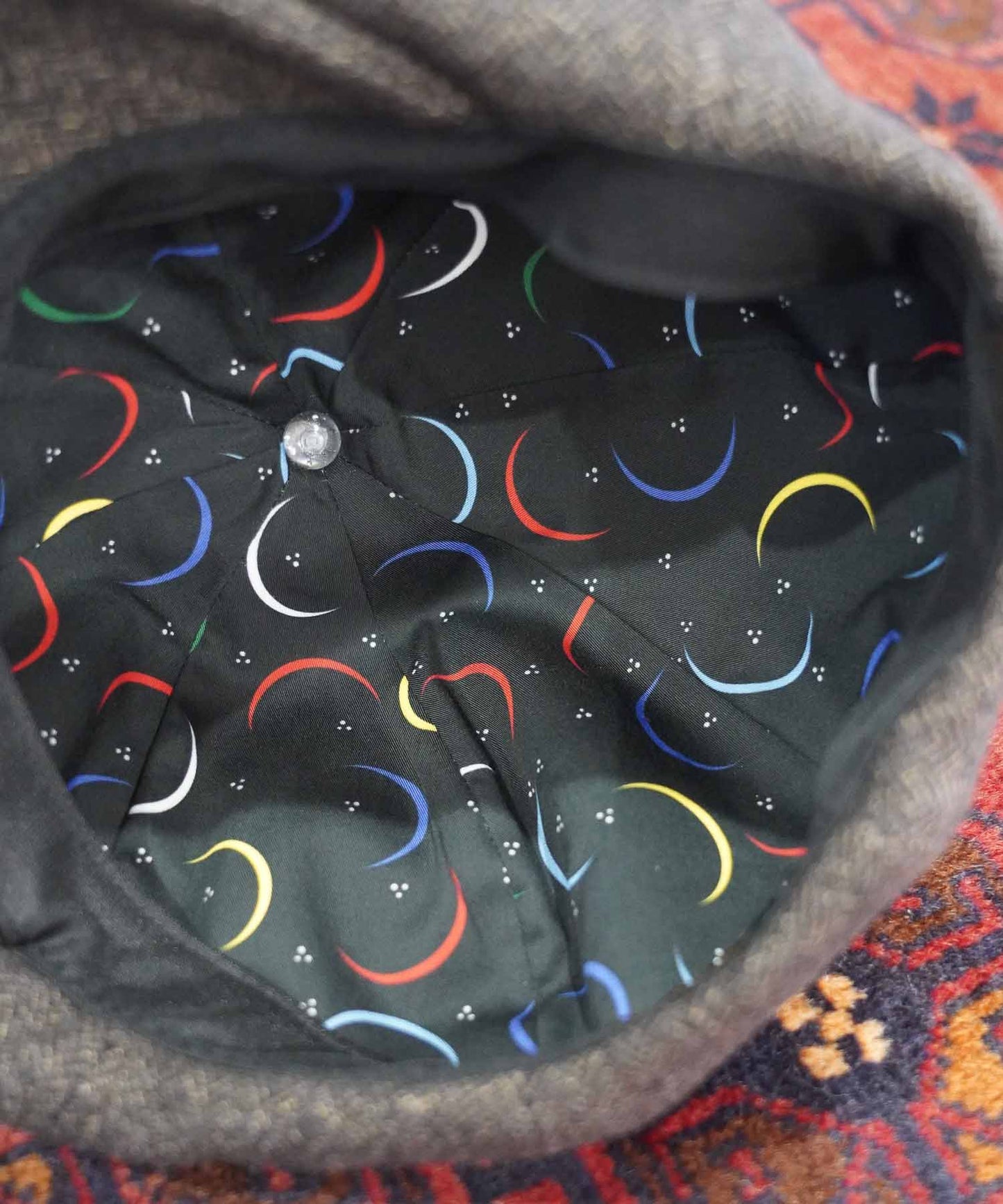 裏地にもこだわり、オリジナテキスタイルのアトミックムーン柄を採用している。